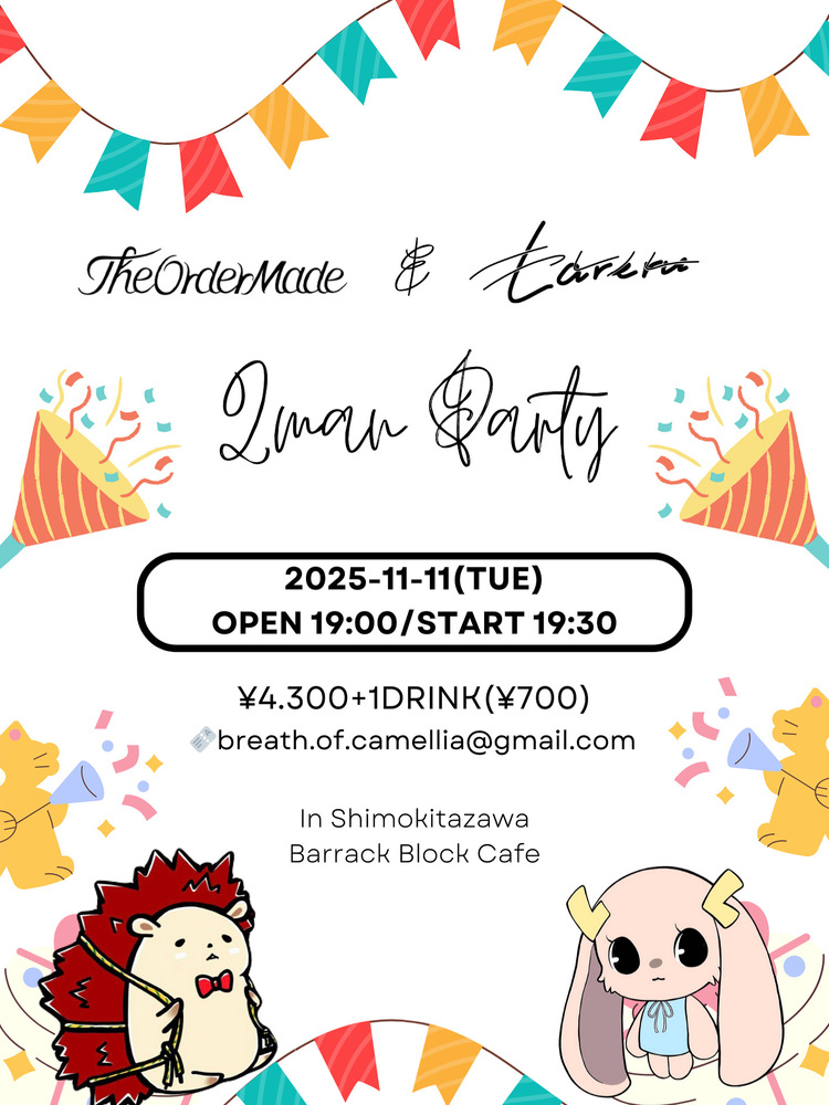 TheOrderMade × Lareru 2man Party SCHEDULE 2025/11/11(火) Barrack Block Cafe 地図を表示 The Order Made、Lareruで出演させていただきます! ご希望の方は、お名前と枚数 を下記アドレスまでお知らせください。 📧 breath.of.camellia@gmail.com URLをコピーする 報告する